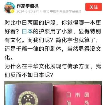 一个作家竟然都攻击到中国护照的字体上了,他采用的参照对象竟然是二本子